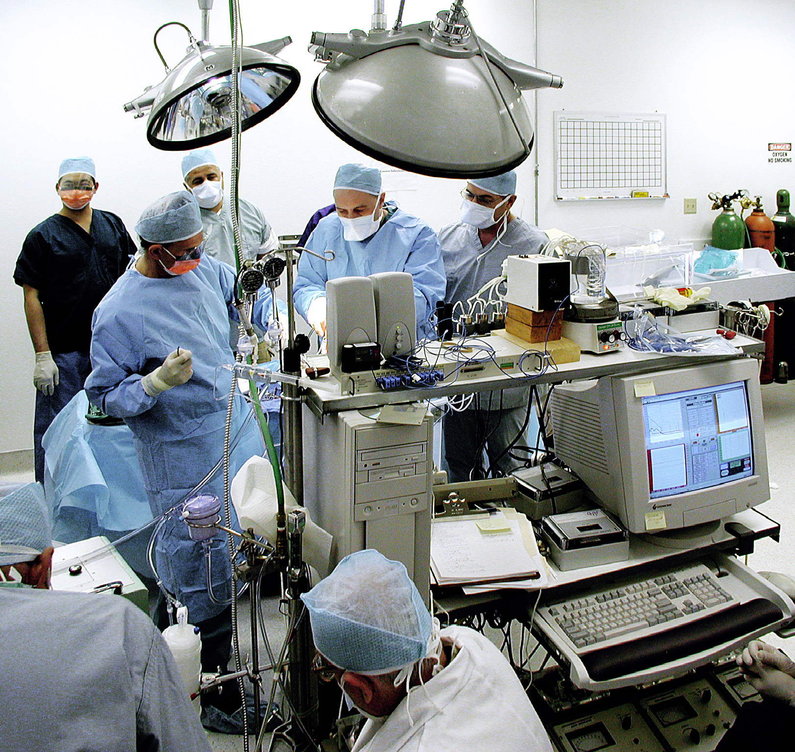 A computer running LabView software displays parameters such as temperature, flow rate, and pressure during cryoprotective perfusion of a neuropatient.